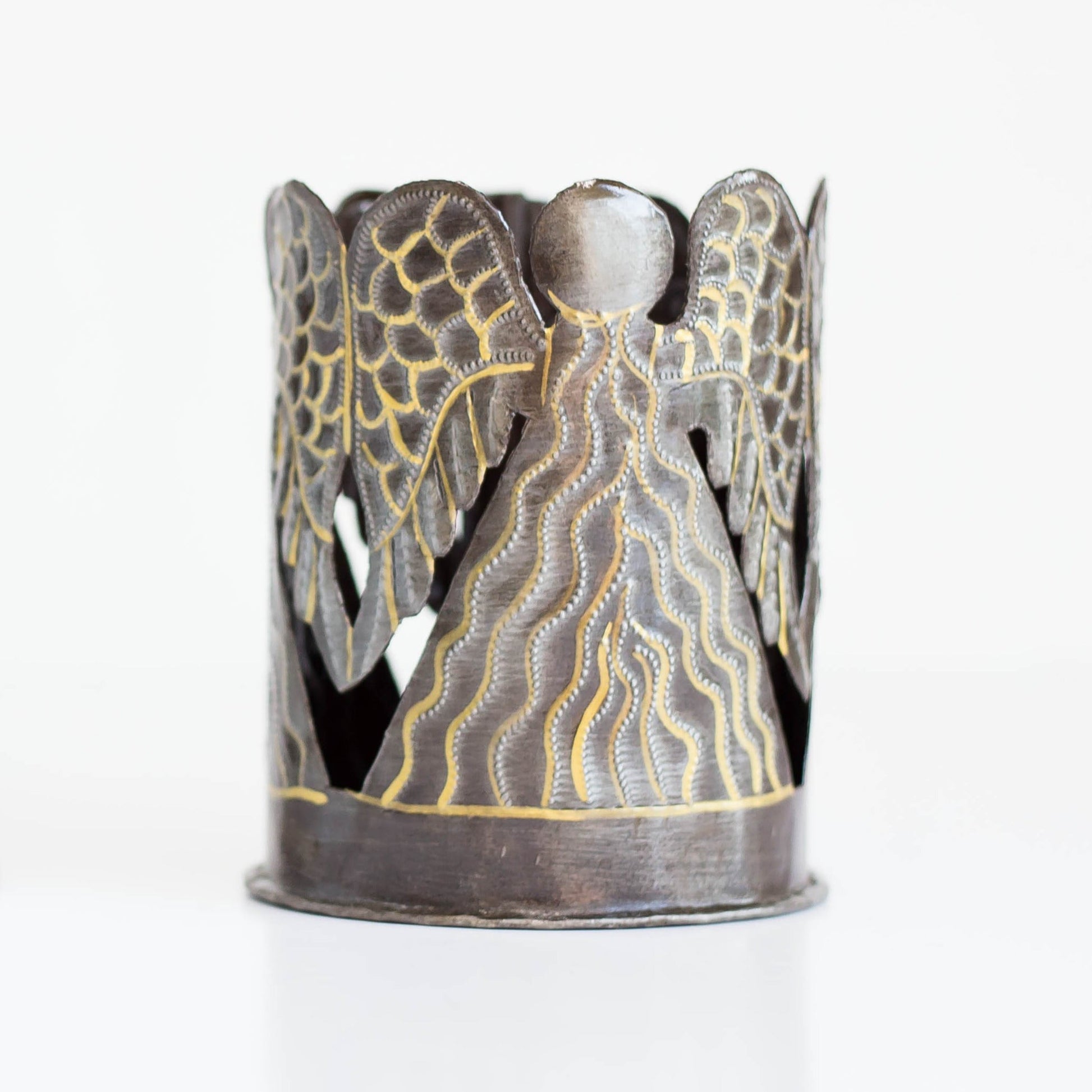 Shine light in your home with this beautiful, hand-crafted metal angel candle holder. Handmade from recycled oil drums by artisans in Haiti, this angel candle holder creates a wonderful work of art to decorate your fireplace mantel or tabletop perfect for your tealights.