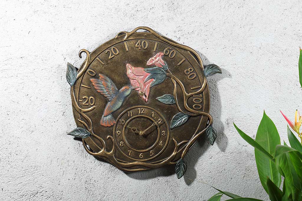 Take a swift sip of the outdoors with this attractive cast aluminum outdoor clock and thermometer, featuring a gorgeous hummingbird, flower and vine! With its eye-catching design, you'll always stay on top of the time and temperature.