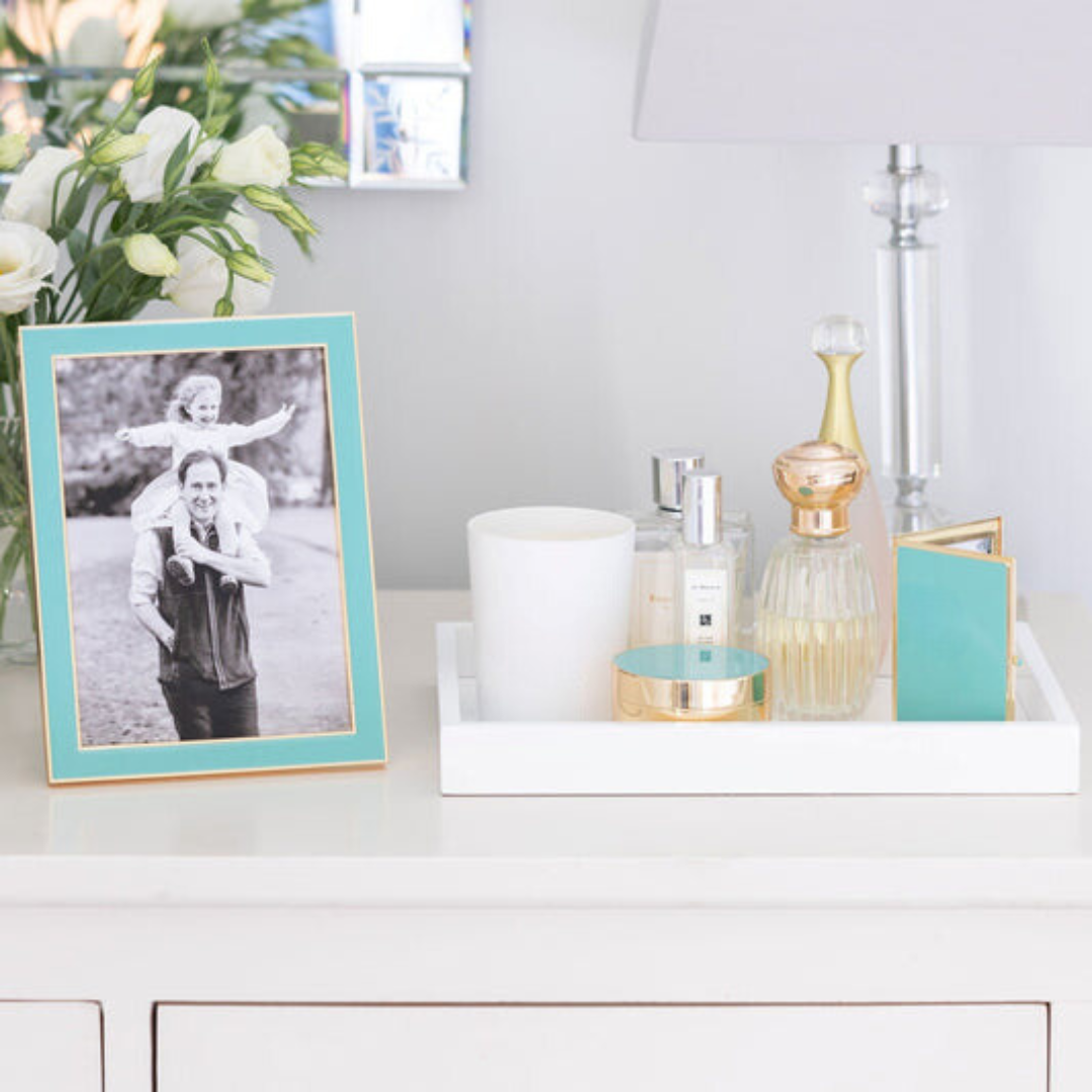 Turquoise blue enamel is finished in gold plate with a luxury dove grey velvet back. Able to stand landscape or portrait this exclusive Addison Ross design is tissue wrapped within our beautiful gift box.