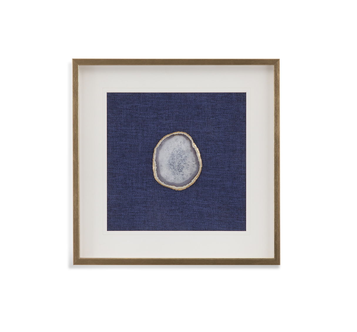 Agate Crystal Wall Art is a shadow box accented with an agate crystal on a blue background under glass with a white matt board and natural molding. D-ring or sawtooth picture hanging hardware included. Material: MDF, glass, agate. This piece of art is hand painted by a skilled artist lending itself to a unique technique and will vary slightly. COO: India.