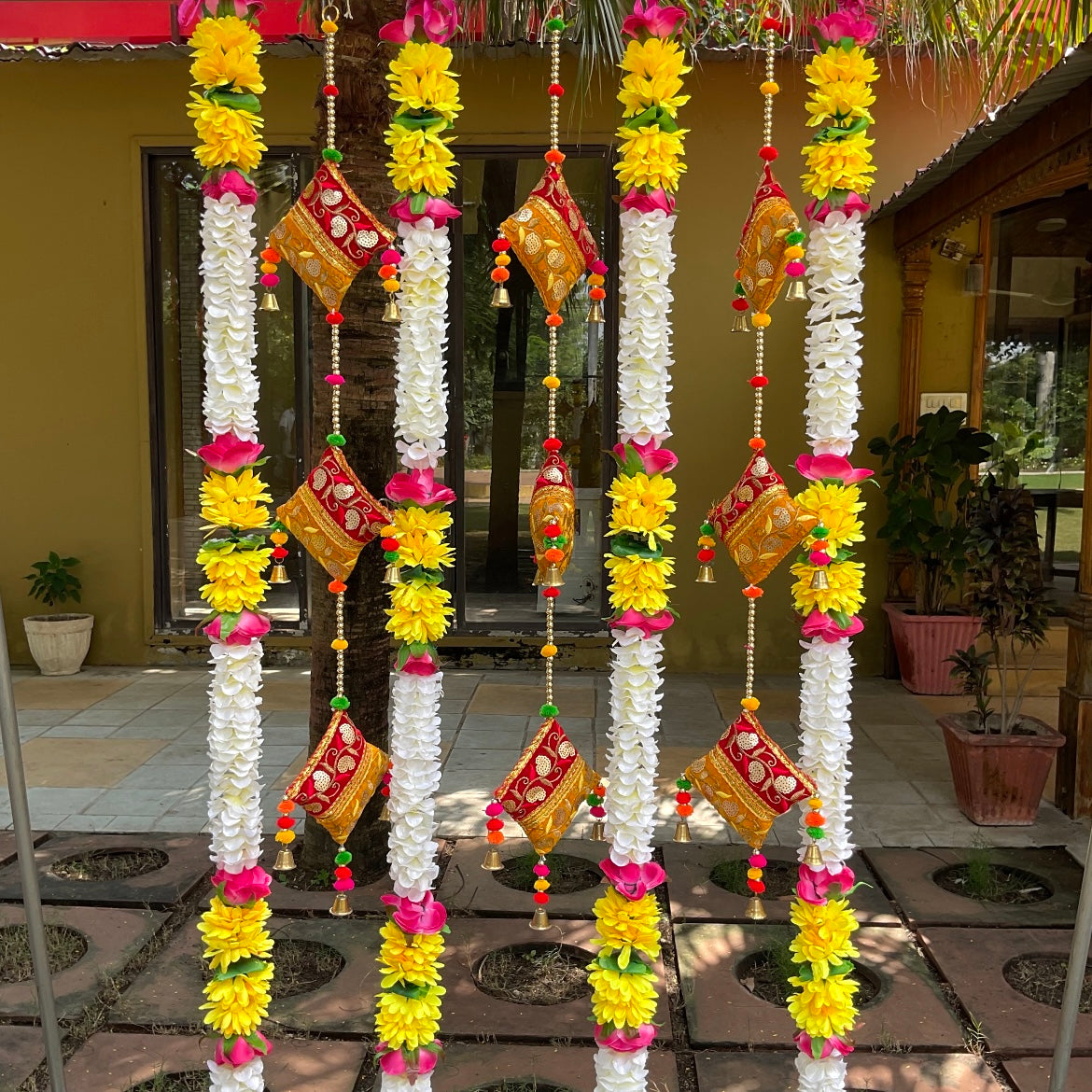 Festive wall decoration with decorative sofa hanging and Flower garlands. It adds colourful festive vibes for home pooja, housewarming or office events.