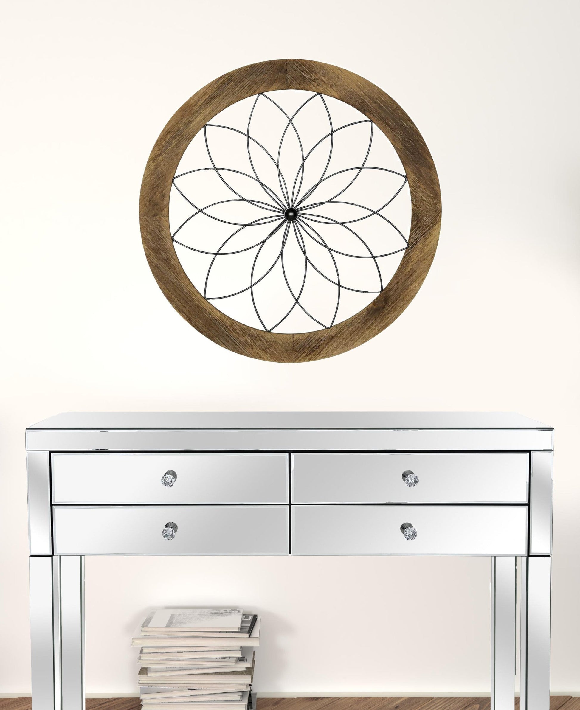 This rustic medallion decor is a must-have accent piece for your home. It flaunts a round floral-themed metal design, bordered by a wooden frame. The frame stands out with its natural grain and knot details, which also add texture to your walls.