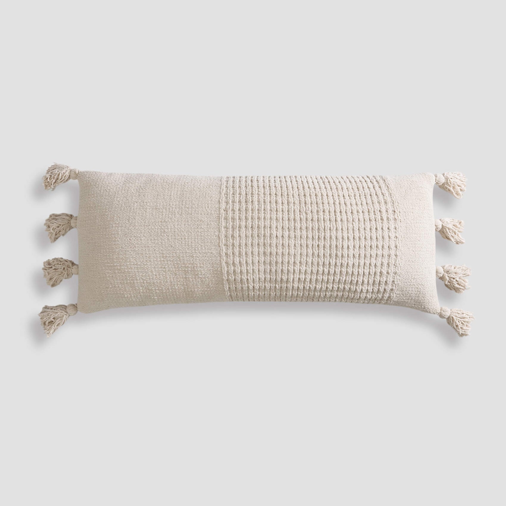Elongated memory foam pillow covered in a removable snug cover that's braided and decorated with pom poms.