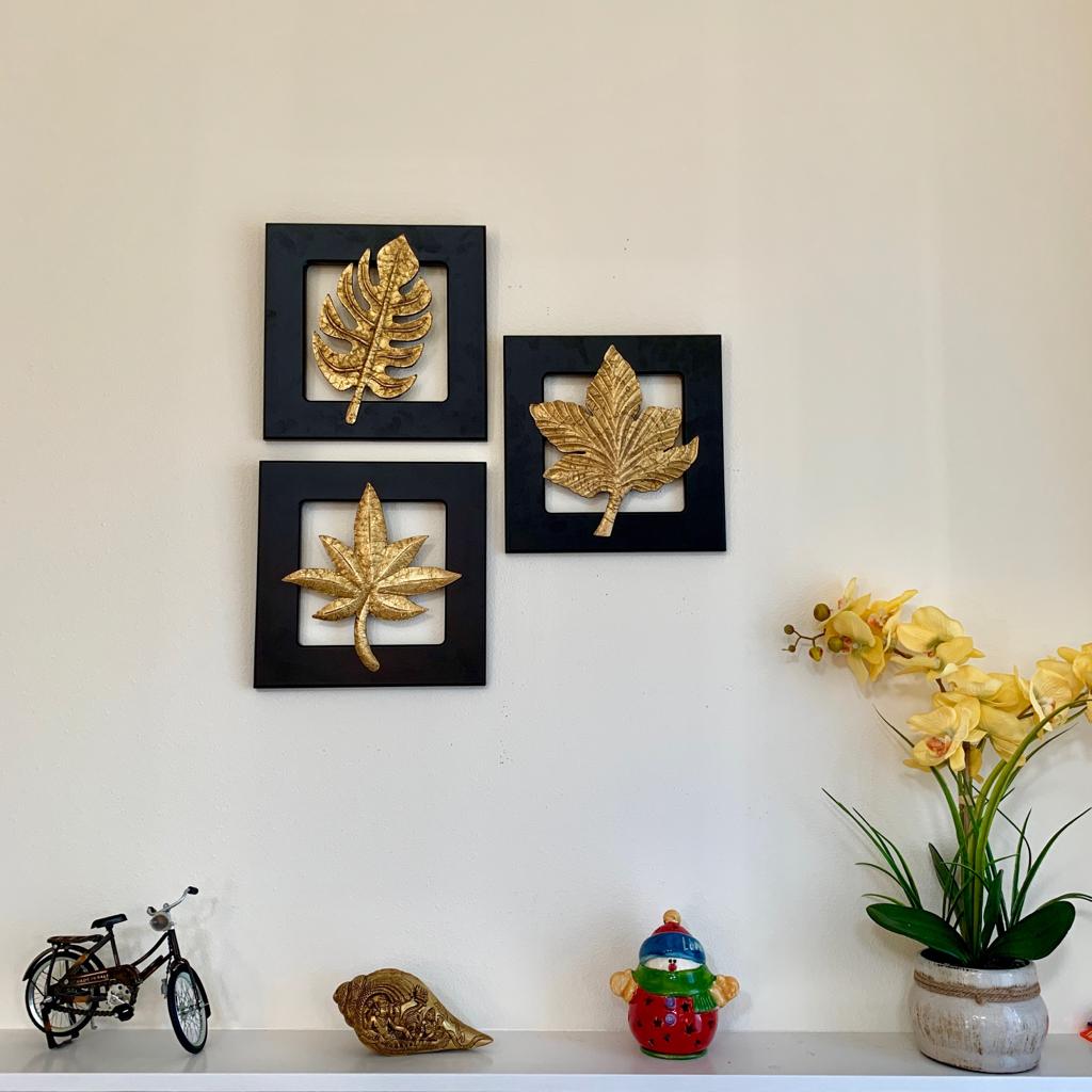 Beautifully molded Brass plated leaf motif with a black wooden border. Perfect for home decor, It enhances the touch of the living room, drawing room, or bedroom.