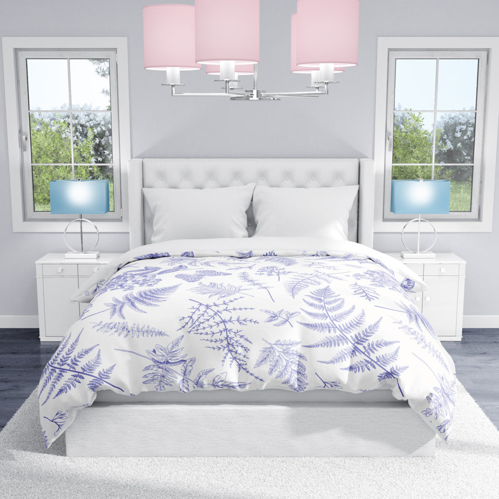 A striking modern floral duvet cover to add a subtle pop of color to your bedroom or your guest bedroom. Bring the outside in with this unique design of lavender ferns and butterflies on a white background.