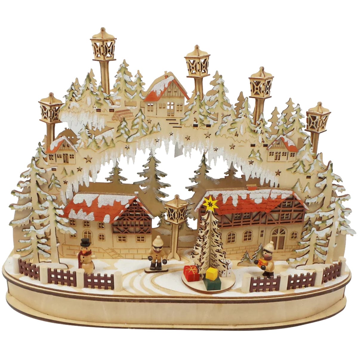 A fun and whimsical scene to light up a table, windowsill or any corner of your home. The Christmas tree rotates to a Christmas melody, while the little houses and lanterns are illuminated. Requires 2 AA batteries, not included