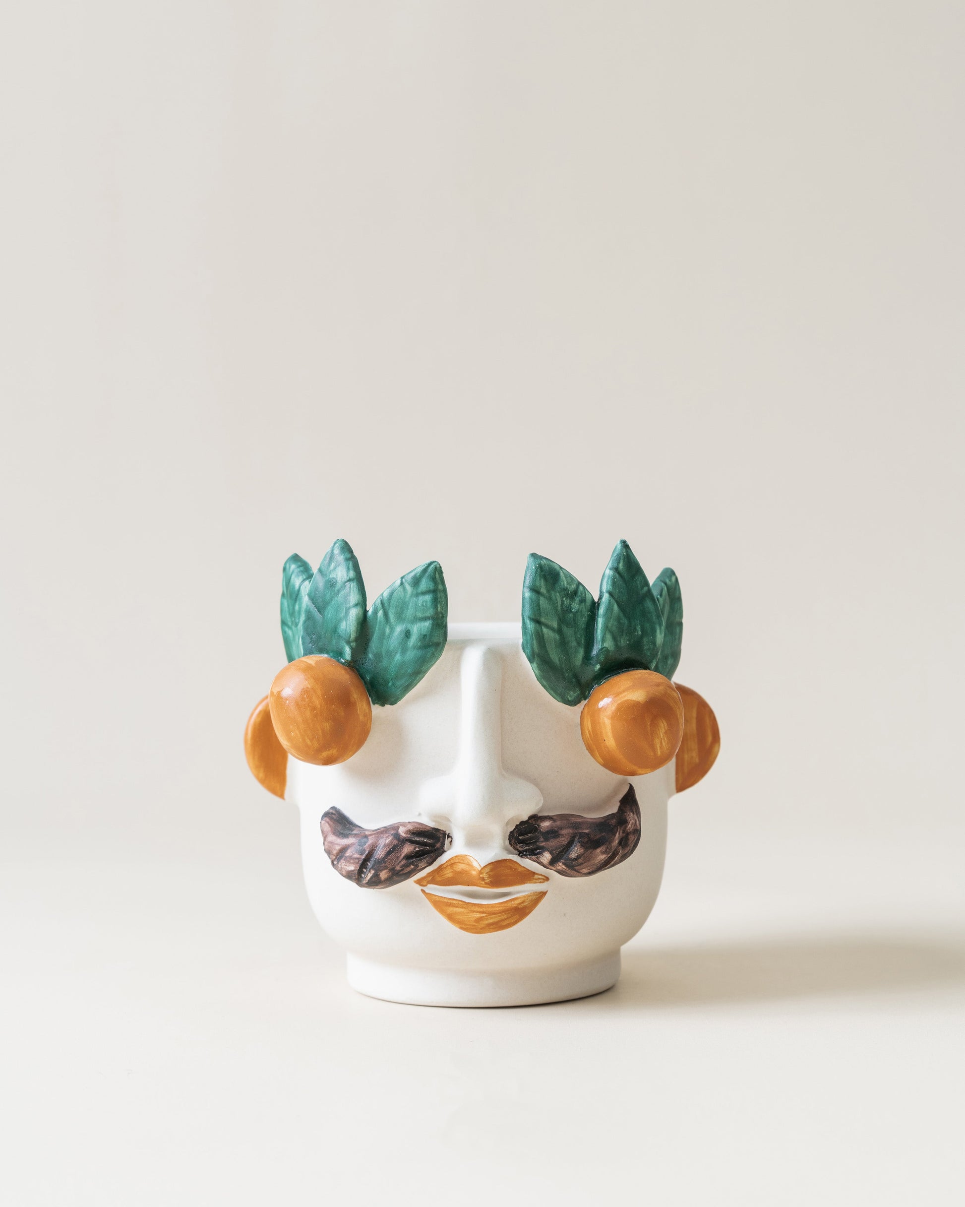 Part of an exquisite series by Patrizia Italiano of fully handcrafted vases paying homage to the characteristic folklore of Sicilian street vendors, this one-off ceramic vase glazed in matt white is a beautiful reproduction of Calogero, a seller of mandarins. Lips are painted the same beautiful shade of orange as the vibrant crown of mandarins with their leaves that surmount the top of the vase like a crown.