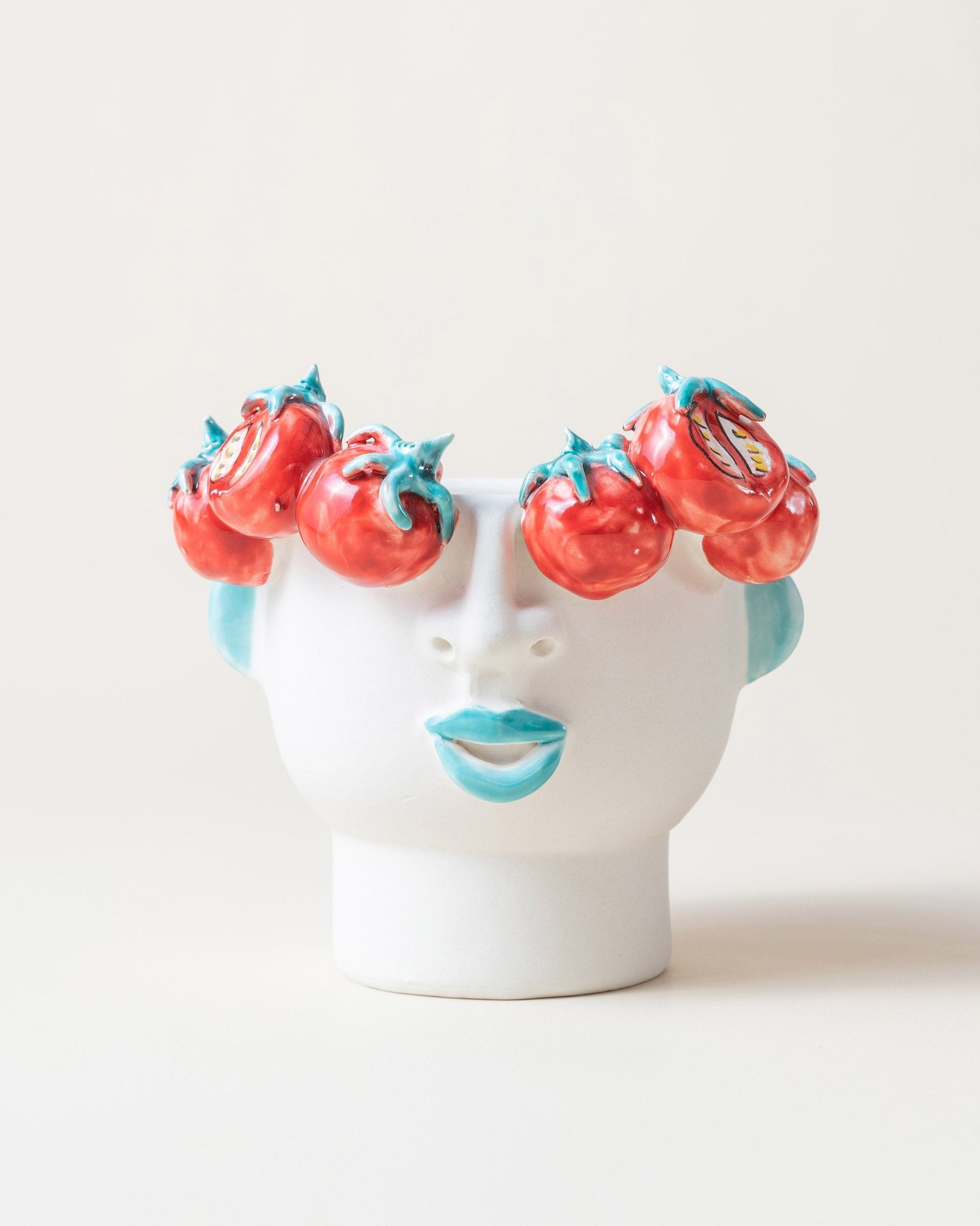 A beautiful and fun handcrafted vase by Patrizia Italiano guaranteed to bring a hint of Sicily to your home. Made of fine ceramic glazed in matte white, it's design features striking green lips and a crown of ceramic tomatoes. We think it's a work of art on it's own, but use it as you wish - for flowers or fruit or even big summer salads!