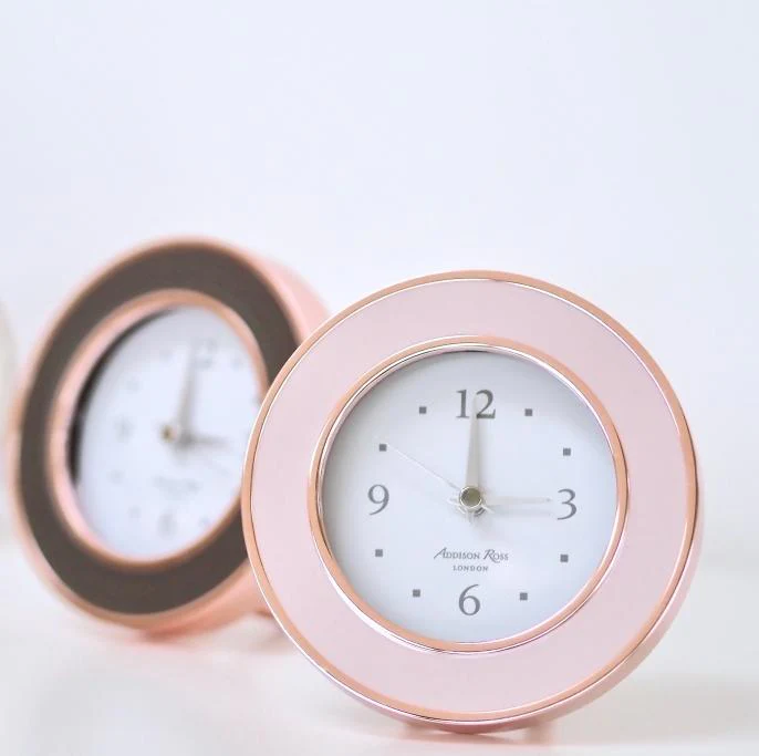The Rose Gold & Pink Alarm Clock is an ideal match for Addison Ross' enamel frames. It is designed to be placed on a desk or a bedside table and features an alarm function. The clock is backed in grey velvet and has a silver clock movement cover. Its smooth sweep movement ensures that you won't hear any ticking sound, but the alarm will still ring loud and clear when set.