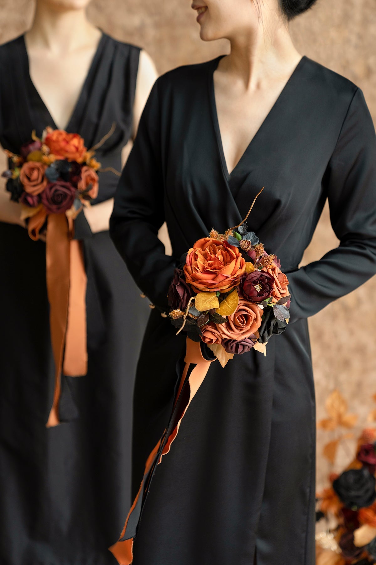 - Size: Each bridesmaid bouquet is approx. 7" W x 13" H. The ribbons: 1.5" W x 5ft L for the burnt orange, 1.5" W x 5ft L for the black.