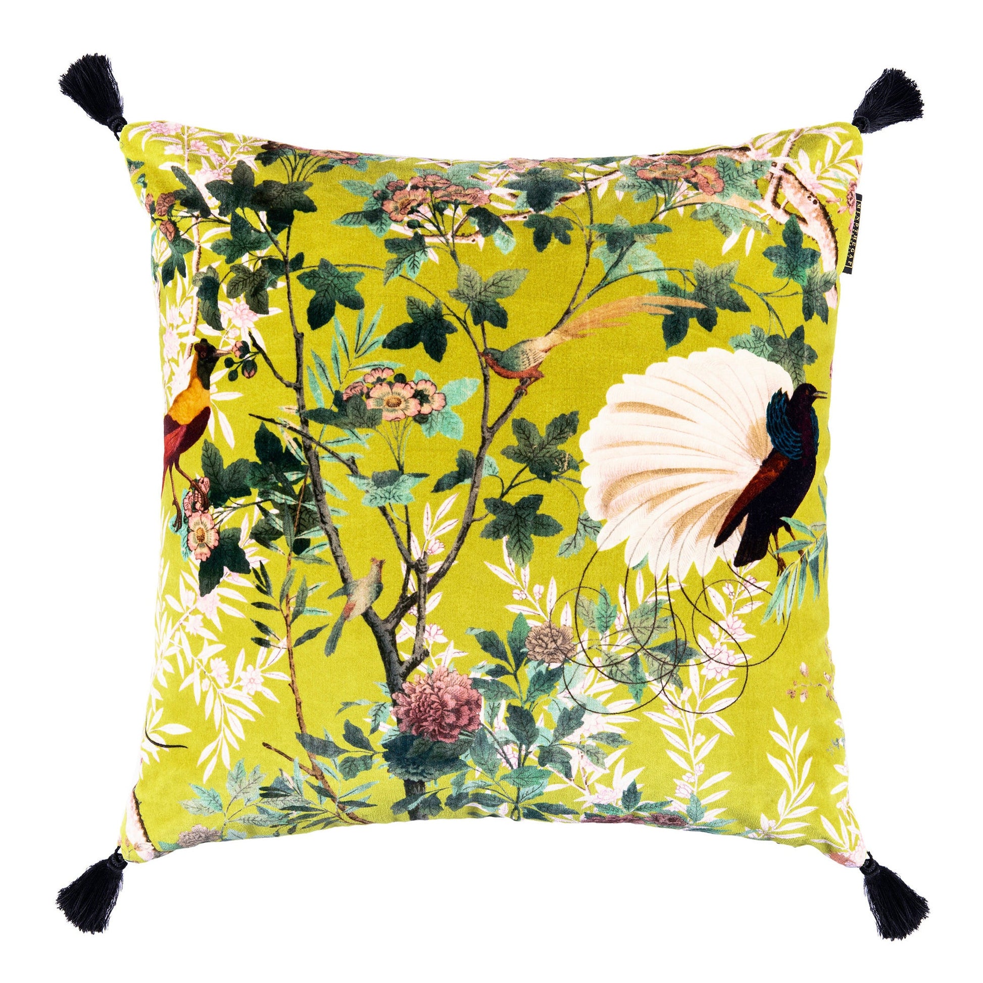 A rich botanical pattern with stunning birds of Paradise illustrated on a idyllic background full of blooming branches.