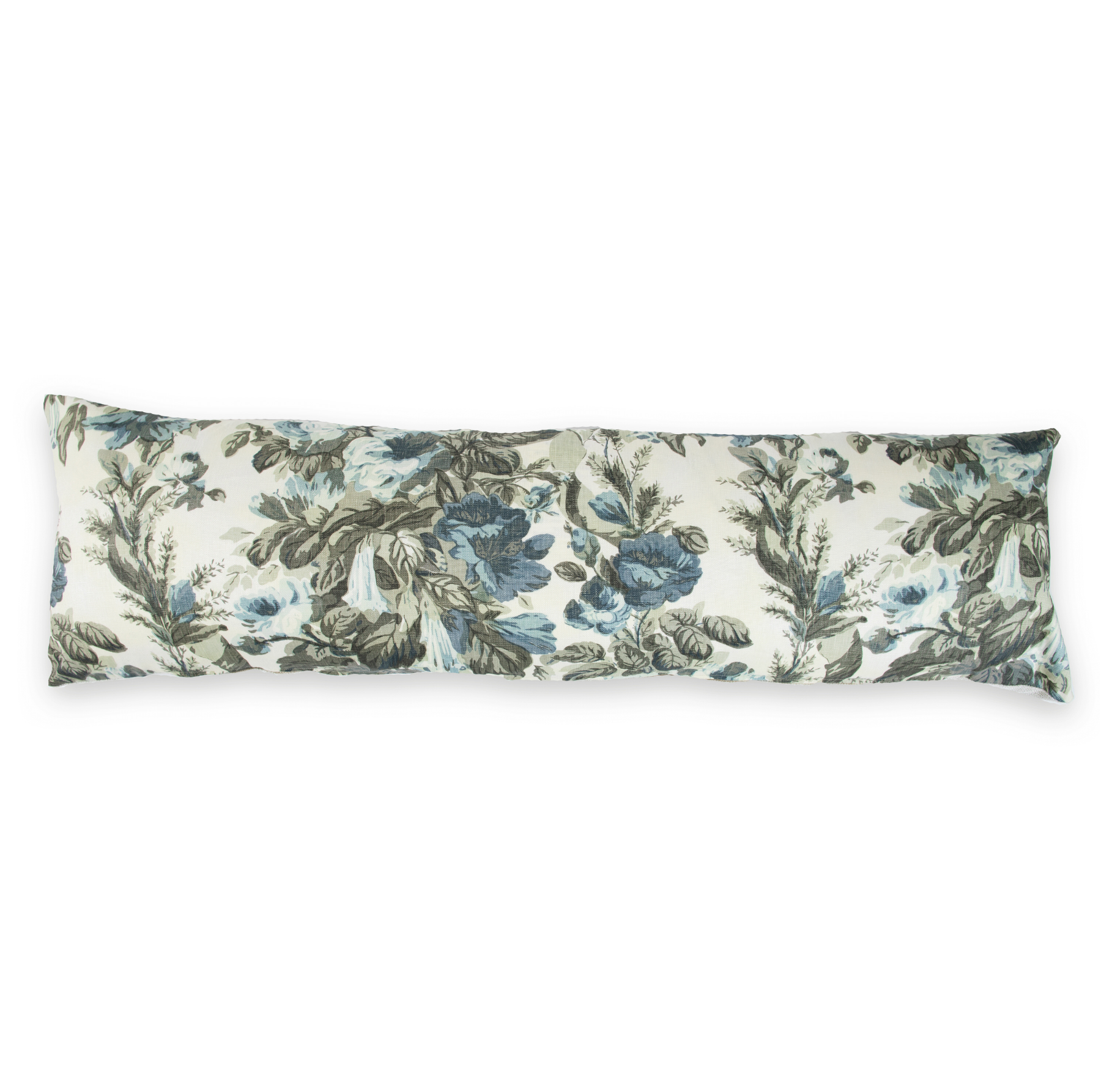 The Claire Pillow Cover features a repeating floral pattern set on a natural background. The floral pattern includes an array of muted grey, blue, and sage tones. Looks beautiful paired with our Delphine and Maxine Pillow Covers.