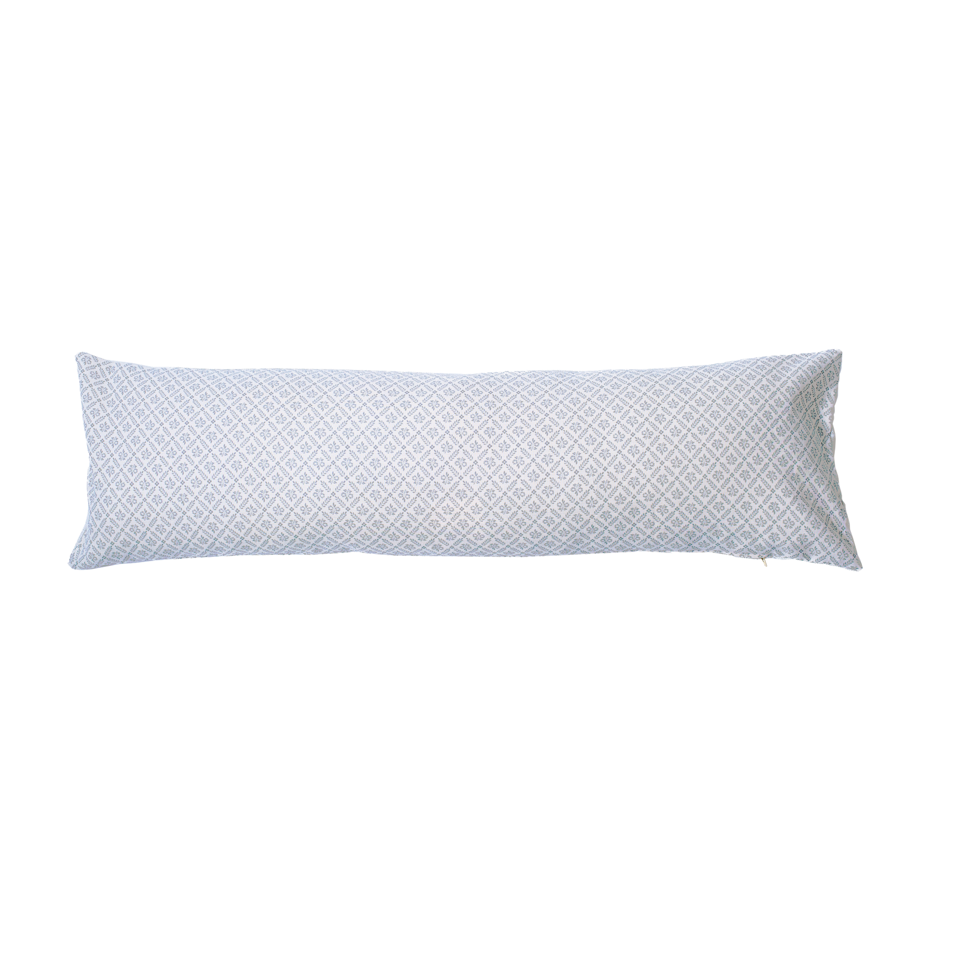 The Elsie Lumbar Pillow features a floral diamond motif in a slate blue color set on cream linen. It is inspired by traditional British design, but its clean lines create the perfect modern fusion. Printed in England.