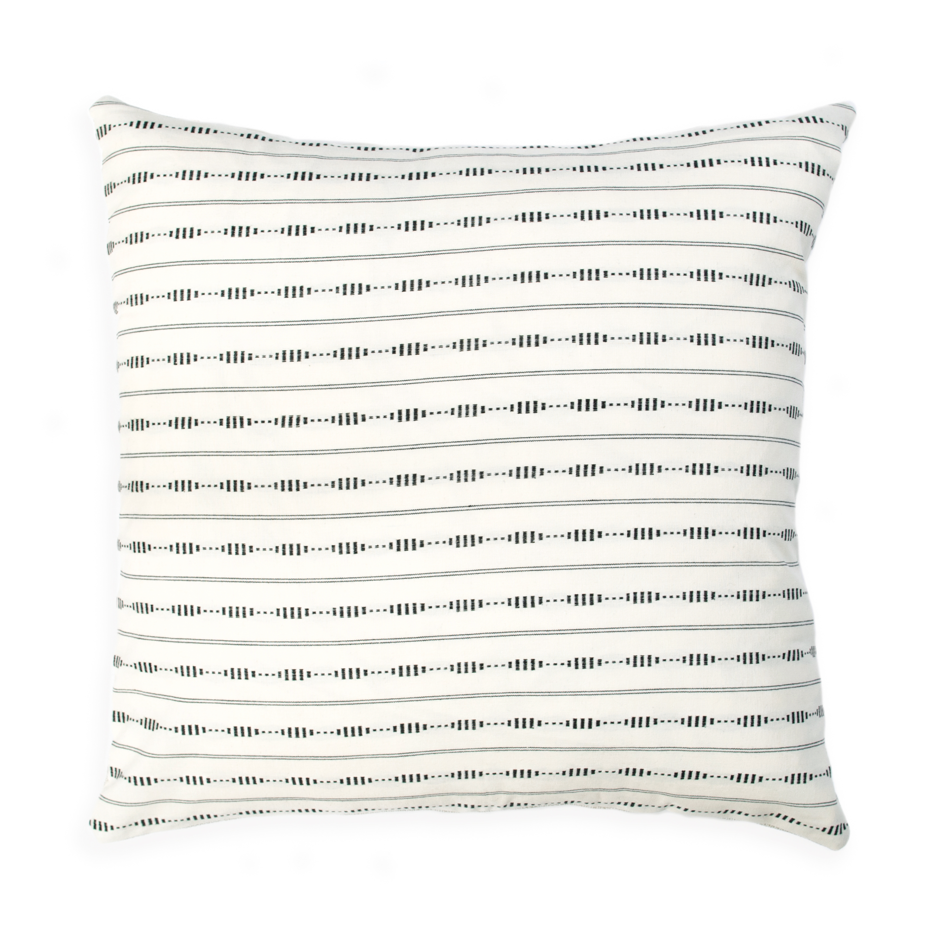 The Florence Pillow Cover's crisp white contrasts with the black stripes to create a modern look, but antique feel with its embroidered pattern.