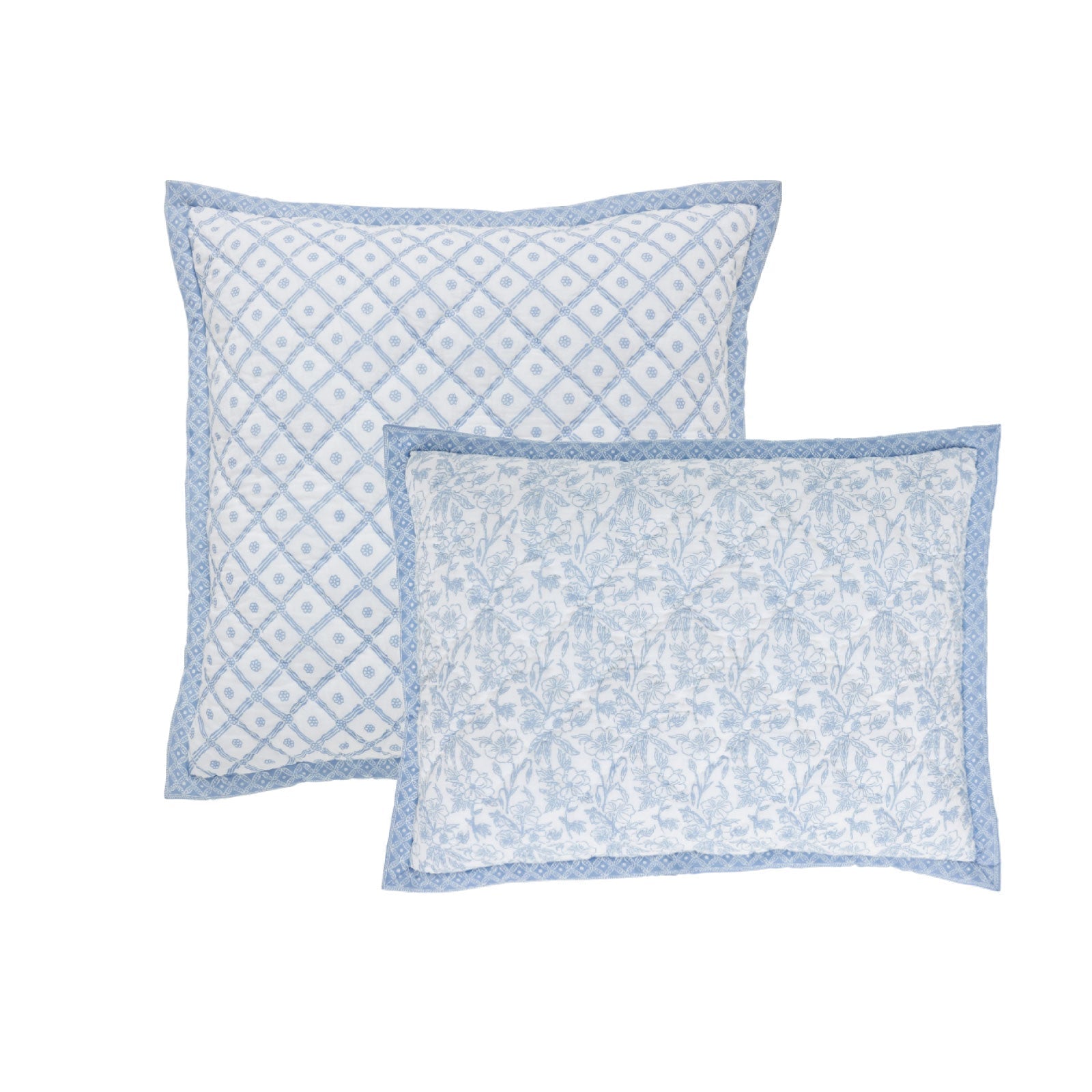 An English botanical is paired with a modern geometric on this reversible, cotton sham.