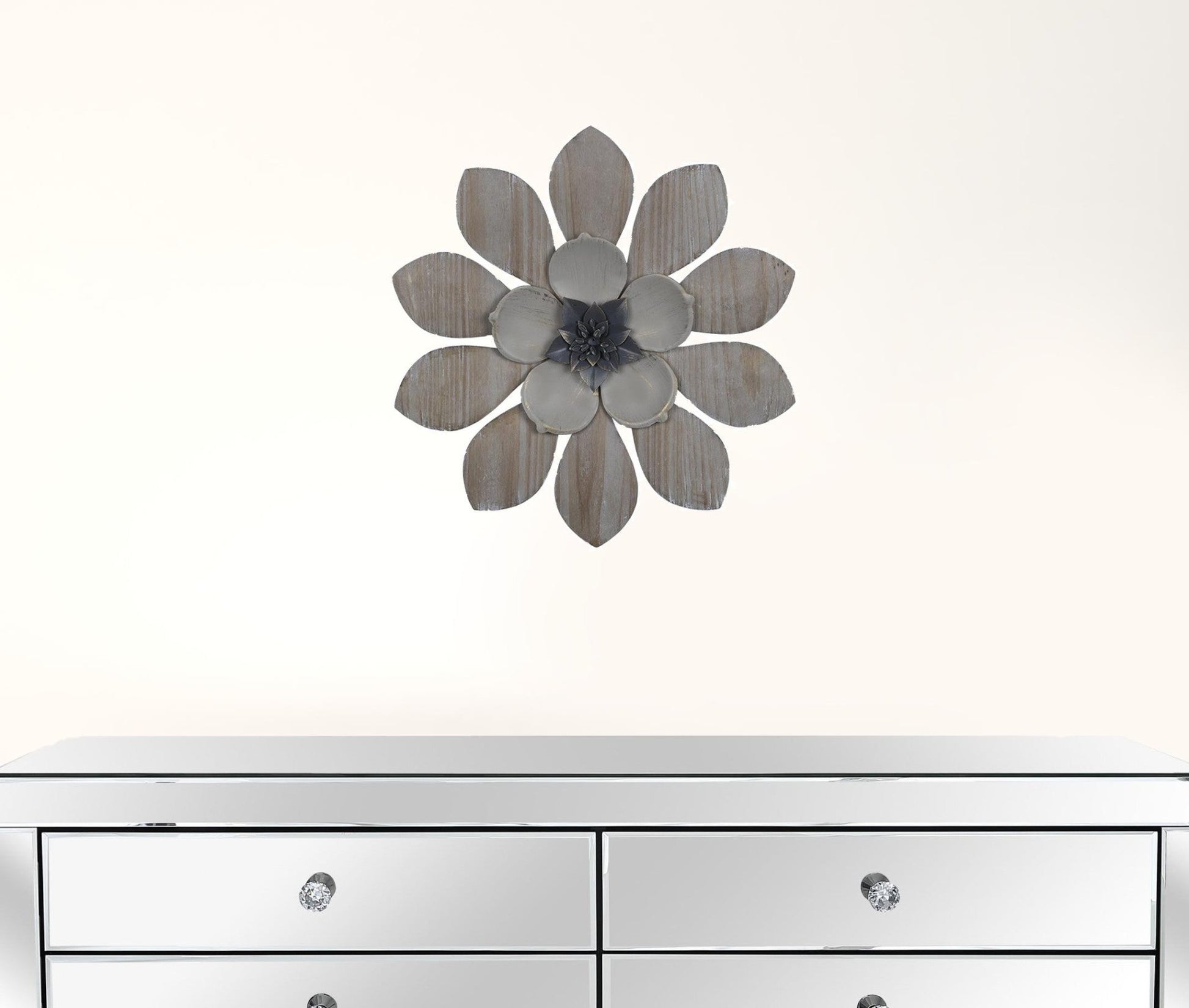 The perfect way to add a pop of floral elegance to your home, this Set of Three Wood and Metal Flower Wall Decor will not let you down. This set comes with three wooden flowers all finished with a light brown varnish on top. In the middle of all the flowers there are metal layers which as depth and dimension to the whole piece. The colors of the metal flowers are all mixed and match and work as a theme throughout the set. You can use these flowers together or break them up around your home. The neutral and muted colors of this set allow you to use it wherever you please. 12.75" H x 12.75" W x 1" D