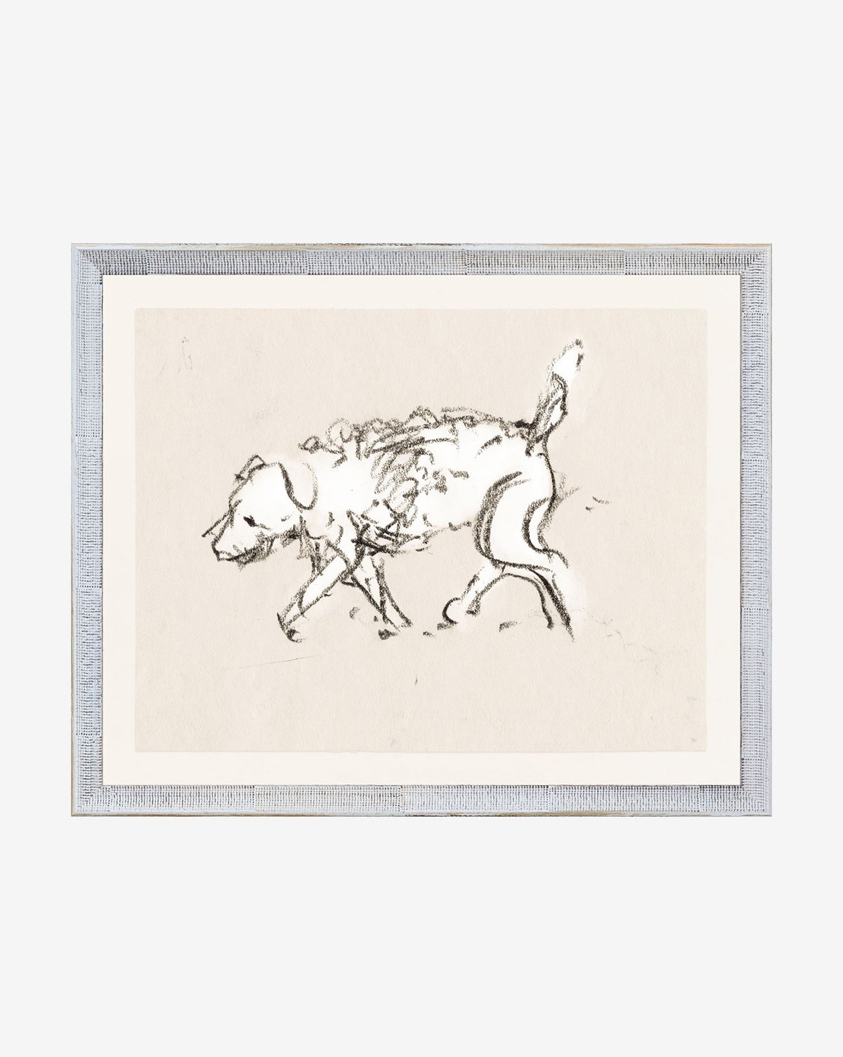 Loosely sketched with charcoal, Shabby Dog is a beautiful print of the original sketch by artist Charles H. Woodbury. This historical print is filled with playful movement, and is presented in a silver, textured wood frame. Encased in clear grade-A glass, Shabby Dog is given museum-quality treatment that makes it a fun yet elevated addition to children’s rooms.