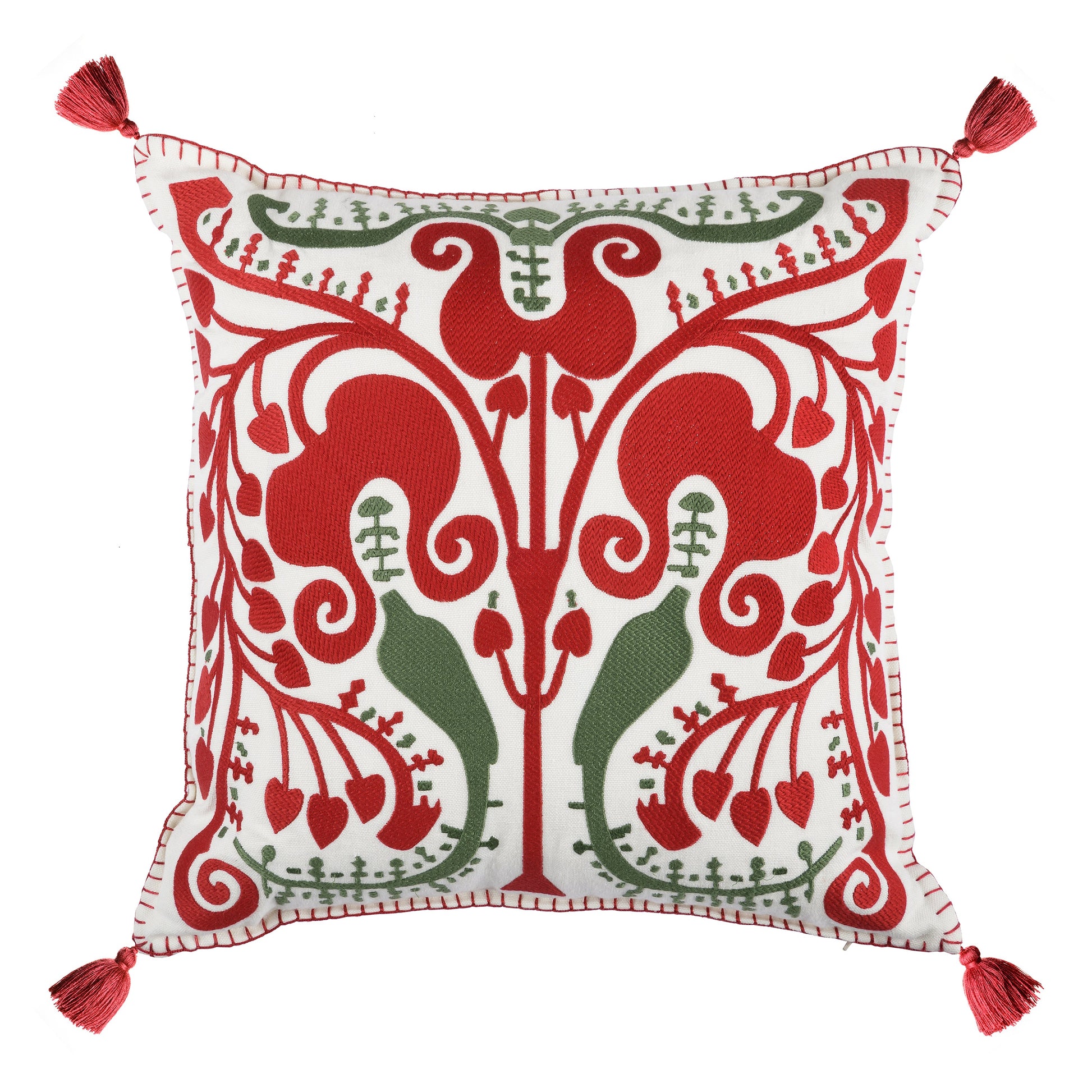 Exuding authentic Hungarian spirit, the full-face quilting on the front of this cushion is showing a beautiful handmade floral design. Decorated on the back with a statement embroidered M letter monogram, the linen cushion is hand- finished with red whip stitch, trimming and red cotton tassels. It comes with 100% duck feathers filling.