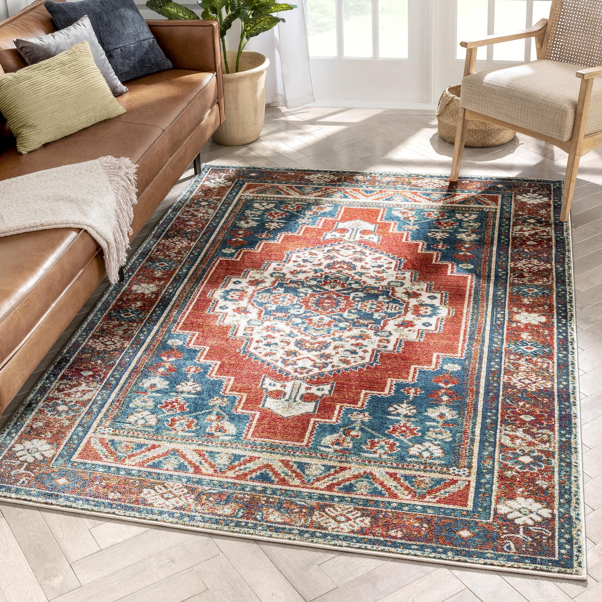 Ucon Southwestern Medallion Pattern Blue Red Distressed Rug