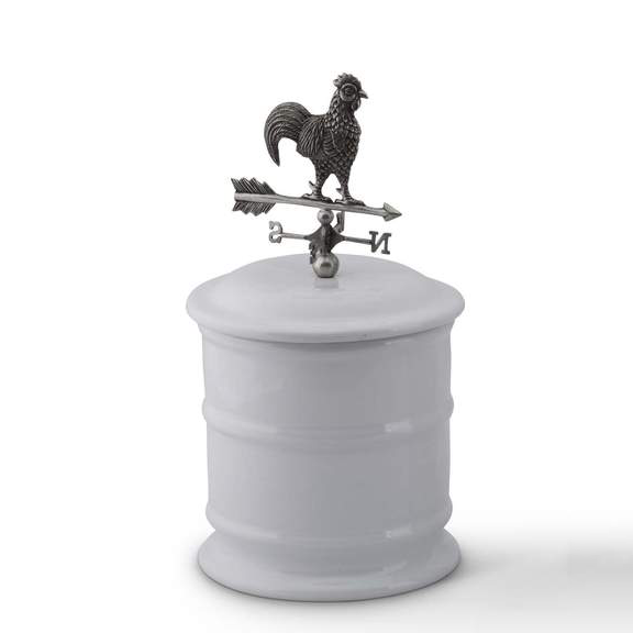 Vagabond House's Rooster Weathervane Canisters marry traditional French country décor and fine stoneware. The luxury pewter Rooster finial is so finely detailed you can see his spurs and pinfeathers. The Rooster image is so closely associated with weathervanes throughout history that a wind vane with a Rooster pointer has a name of its own, a Weathercock.