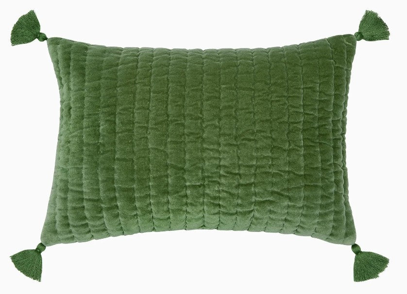 Soft and luxurious velvet, hand quilted by Indian artisans. Tassels on the ends for extra fanfare. Explore our matching velvet throws to keep this pillow company. Includes pillow insert.