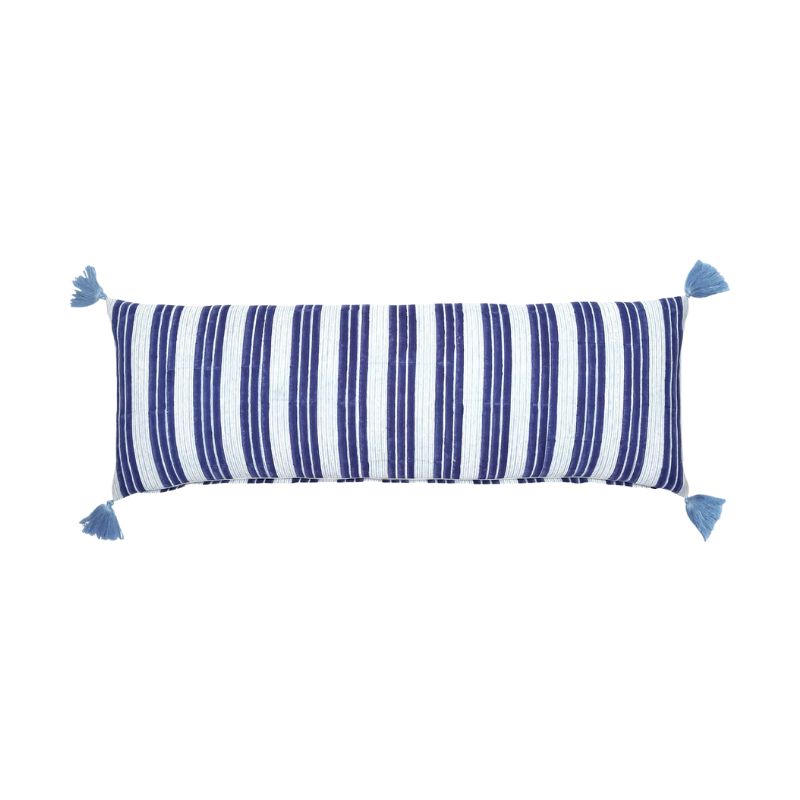 hn's classic stripe print is block printed by hand with coordinating blue tassels on all corners. Block prints show slight irregularities and give each pillow its own unique charm.