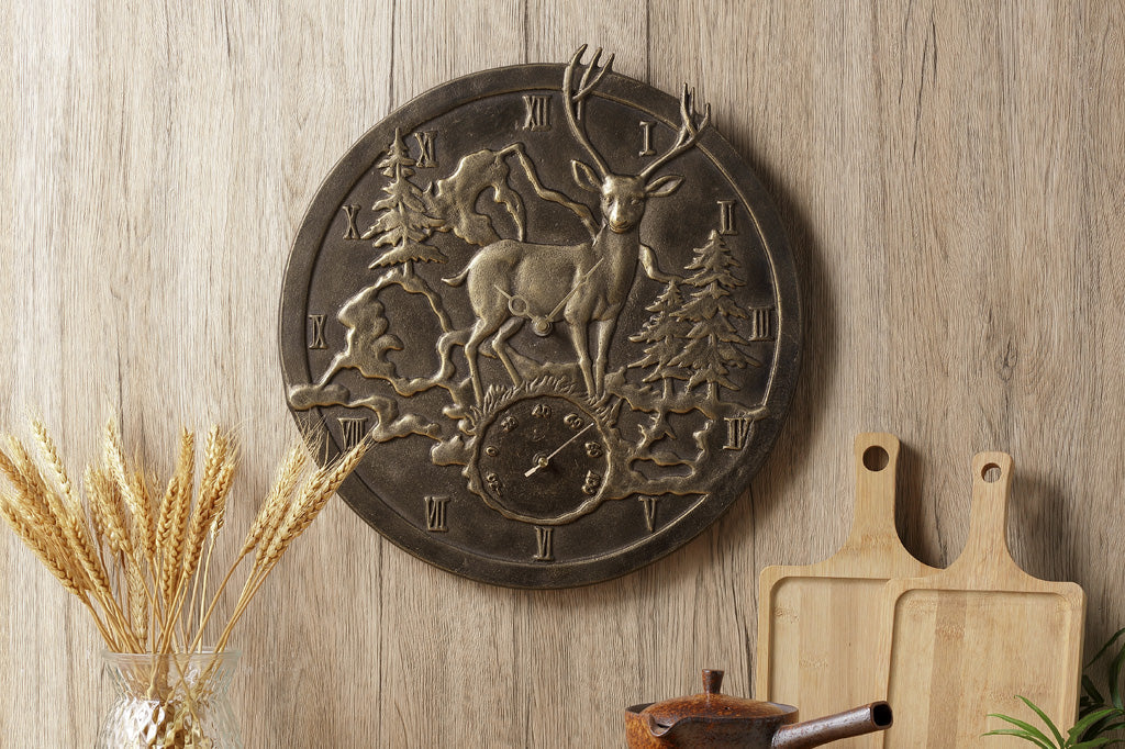 This stunning Woodland Prince Clock and Thermometer is the ideal choice for any cabin-style home. Boasting a majestic stag atop an alpine mountain, this indoor/outdoor piece brings beauty to your décor and convenience to the daily routine. Easily monitor the time and temperature with a single glance. 16"H 15.5"W 2"D Cast Aluminum with battery-operated clock.