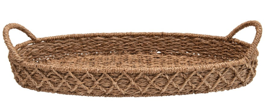 Make this seagrass tray a statement piece in the living room or bedroom of your home. Fill it with dried botanicals and a selection of books to display on the coffee table or oversized ottoman. In the bedroom, place in the middle of the bed and display a decorative "breakfast tray" setting with small plate, cup and saucer and small vase with a single flower inside.